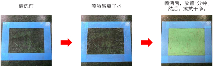 ◎油污清洗效果事例(試驗(yàn)物:加工現(xiàn)場(chǎng)被切屑液污染的地面)